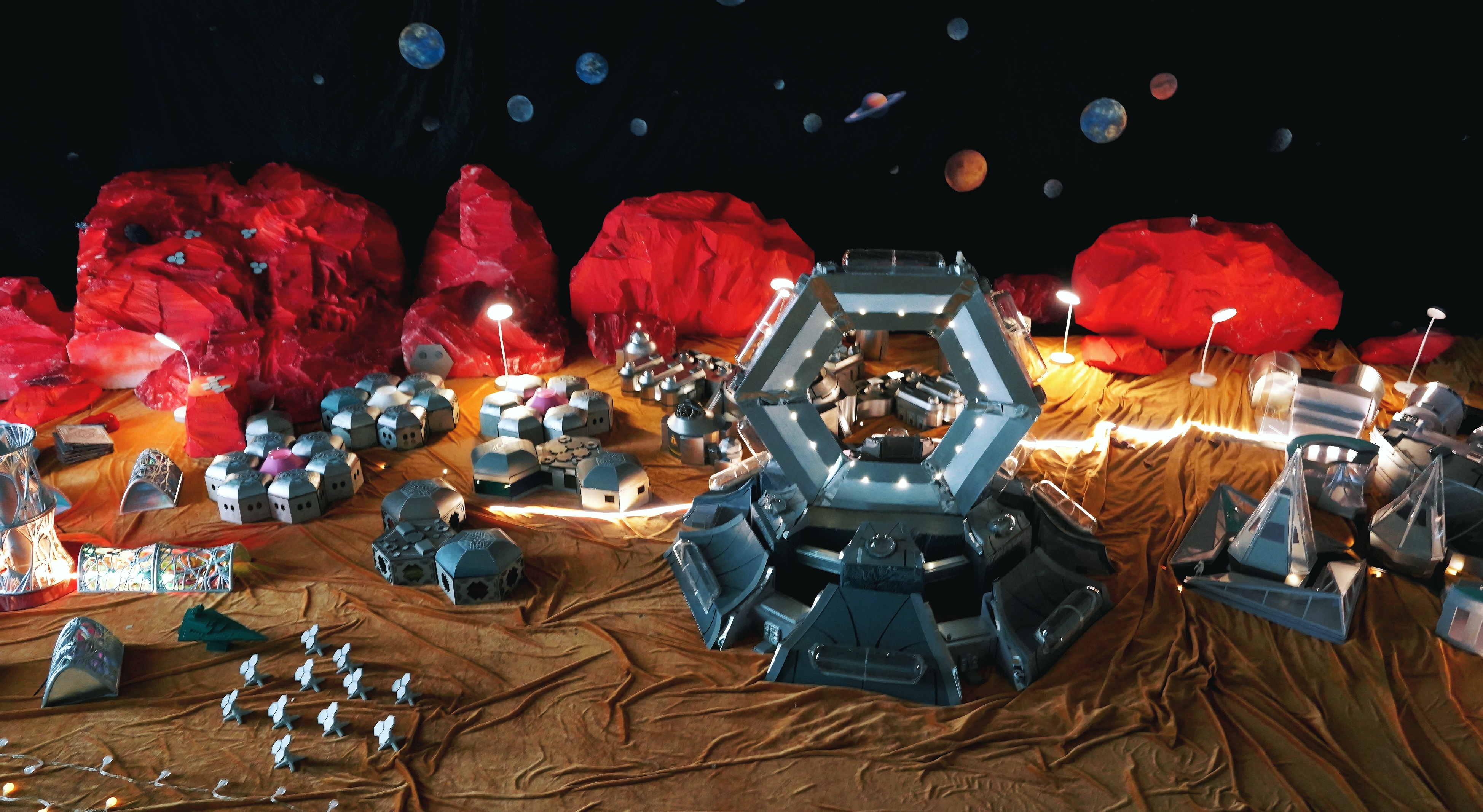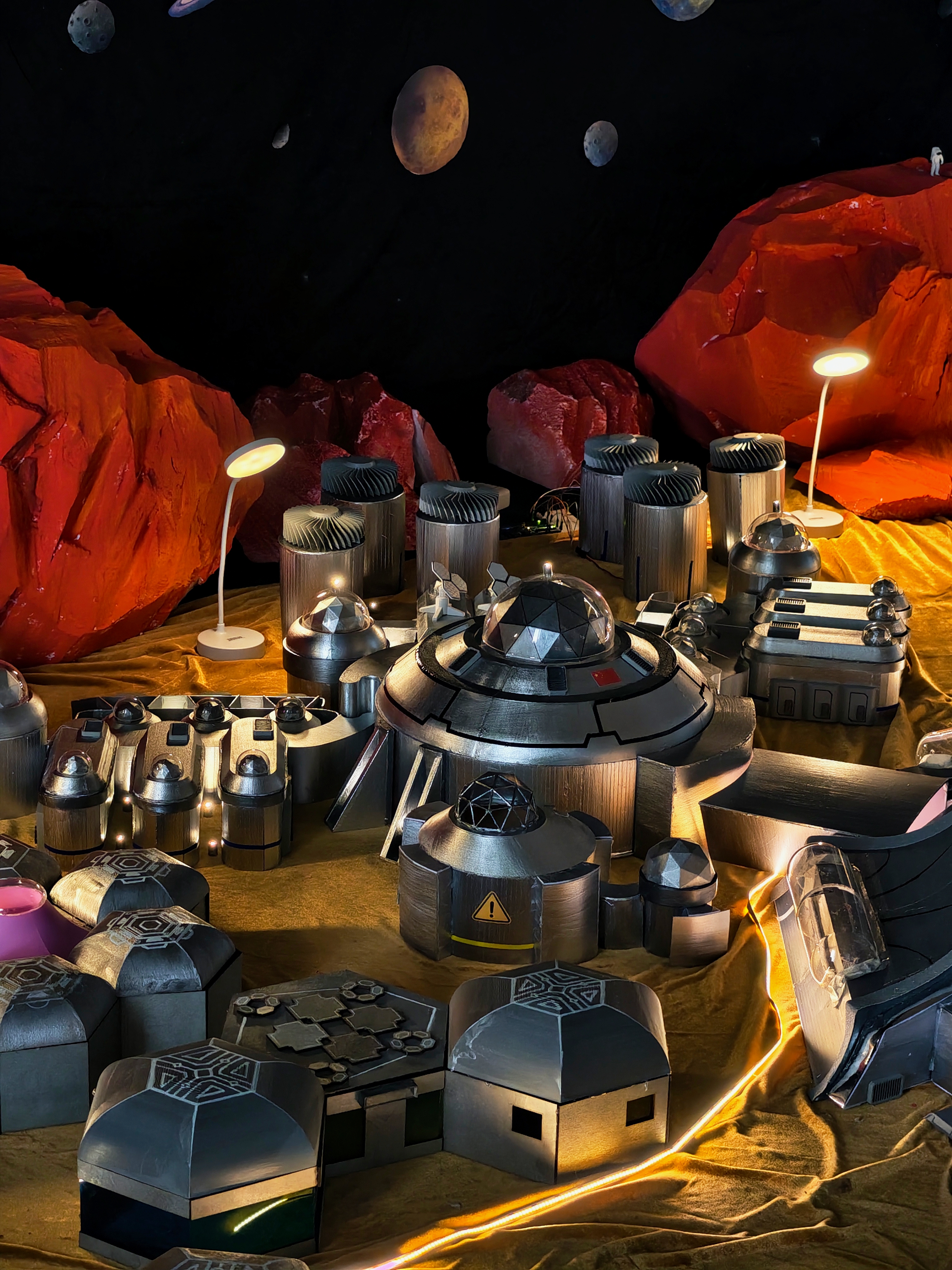 本次展览的重磅作品之一,便是由学生团队完成的“火星基地2026”大型概念模型。这不是一个简单的建筑模型,而是一座微缩的“火星城市”。基地以构建火星可持续社区为设计蓝本,集成了中控指挥、住宅生活、生态循环、物资运输、科研能源及可扩展舱段六大功能模块。中控区统筹全局数据与应急响应;住宅区运用多层防护材料营造宜居环境;生态区通过受控环境农业实现食物自给与氧气再生;能源区依托风能与太阳能互补系统,实现能源自循环。更吸引人的是,这个基地会“动”——模型启动后,贯穿基地内外的LED灯带将按预设程序变幻光效,勾勒各功能区轮廓;太空舱区的柔性气囊会定时充气展开,模拟双稳态结构的动态特性。灯光与机械的协同运行,生动呈现未来火星基地的智能化运行与生态自循环状态。设计背后,是学生对“再造家园”的思考。突破单一生存视角,构建一个具备生命支持、生产制造与社会功能的微型城市雏形,展现人类在外星球上通过科技与自然共生、缔造可持续文明的可能性。模型采用雪弗板手工切割与3D打印制作主体,结合亚克力透明罩展示内部结构,激光切割木板制作框架与地形,TPU柔性气囊模拟可充气舱段,LED灯带贯穿内外——每一处细节,都凝结着学生对技术、空间与未来的探索。